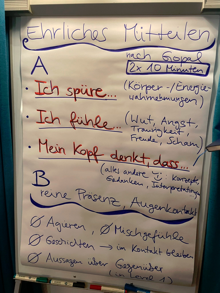 Wir kommen an, bei uns, im Raum und in der Verbindung, behütet, verspielt und gewollt. Ein erstes Gefühl von Sicherheit ist entstanden. Wir sind bereit, uns langsam an unsere Verletzlichkeit heran zu tasten. Jeder ist eingeladen den Satz: „Manchmal tue ich so als ob ..., obwohl ich eigentlich ...“ für sich zu vervollständigen. Die ersten Masken fallen, es wird berührbarer, tiefer und vielschichtiger. Aus einem wilden Herzklopfen wird Erleichterung. Ich darf mich in der Gruppe zeigen auch ohne Maske und werde trotzdem angenommen, bin willkommen so, wie ich bin. Etwas entspannt sich im Gruppenkörper, ein erster herausfordernder Schritt Richtung Vertrauen ist getan.